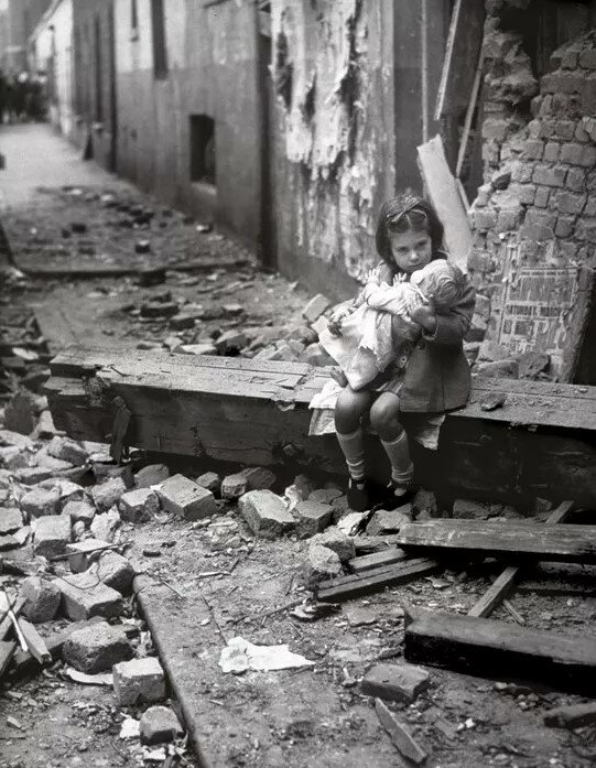 Malá holčička houpe panenku, zatímco sedí na troskách svého rozbombardovaného domu. Londýn, 1940.