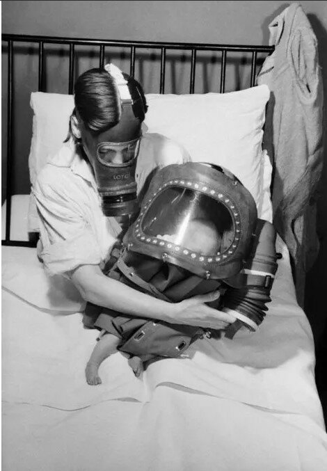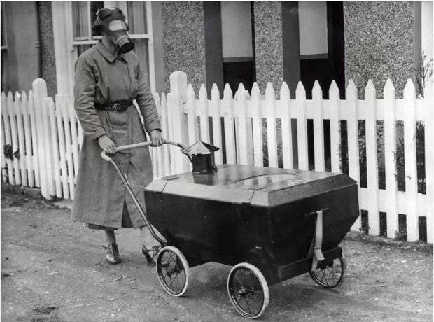 Žena v plynové masce válcuje uzavřený kočárek. Během druhé světové války německé letouny shazovaly na Británii plynové bomby. Mnoho občanů s sebou neustále nosilo plynové masky. Jak bylo uvedeno v jednom z motivačních plakátů:" Udržujte klid a pokračujte ve stejném duchu " (Keep Calm And Carry On).