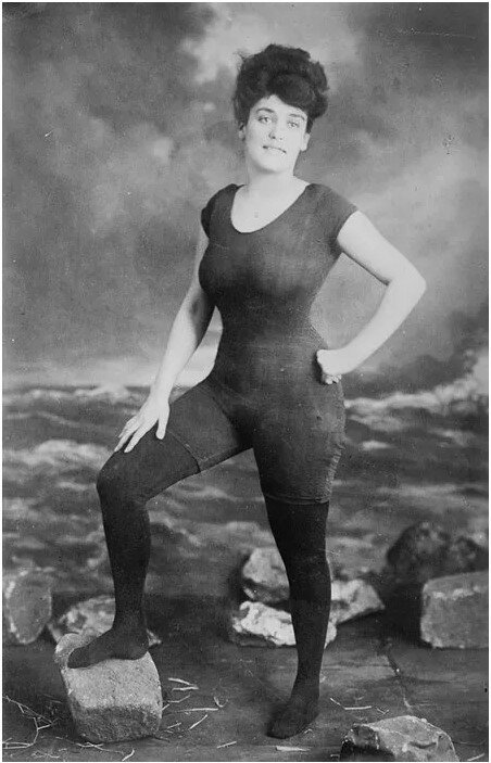 Annette Kellermanová prosazuje právo ženy nosit plavky, 1907. Byla zatčena za neslušné chování.