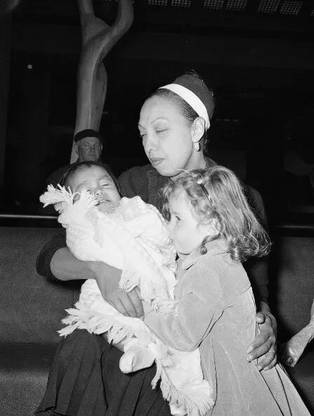 Josephine Bakerová bojuje proti rasismu tím, že adoptovala 12 dětí různých etnik z celého světa. Na fotografii drží své desáté dítě, chlapce z Venezuely (cca. 1959).