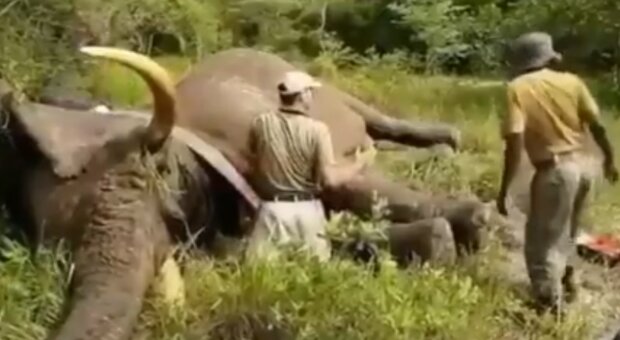 V tomto případě leží na zádech a opírají se o strom nebo keř. Když se slon probudí, bude pro něj snazší vstát.