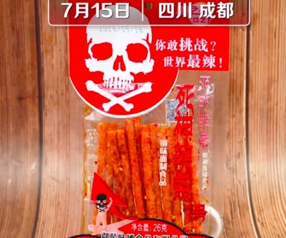 Slečna musela sníst velmi ostré jídlo - rybí tyčinky pokryté vrstvou feferonky. Kromě toho, výrobce teto svačiny umístil na obal lebku se zkříženými hnáty, aby varoval zákazníky před možným nebezpečím.