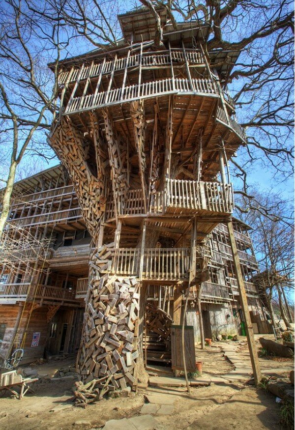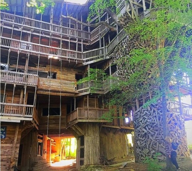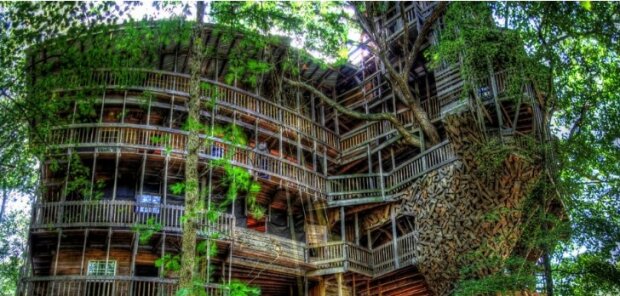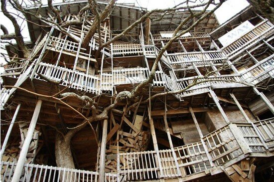 Velikost této unikátní svými rozměry zařízení – 930 metrů čtverečních, má 10 pater a 80 pokojů a oporou pro dům slouží hned šest stromů.
