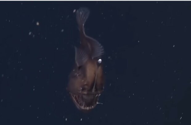 Ztělesnění noční můry. Tato skvrnitá, tmavá ryba se zářícími obrovskými očima láká svou oběť s bioluminiscenčním procesem na bradě.