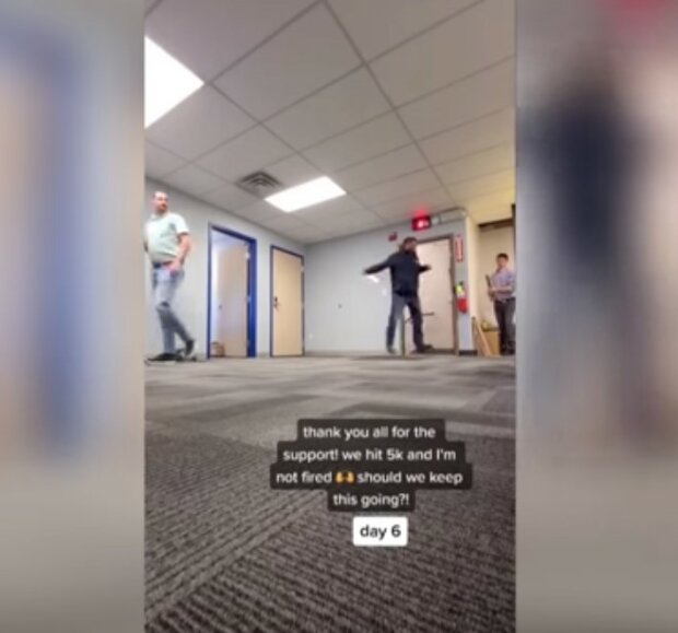 Buď někde chytil kostým Tyrannosaura a v kanceláři zřídil Jurský svět, pak v nejneočekávanějším okamžiku zapnul elektrickou pilu. "Budu to dělat každý den, dokud se na mě nepodepíše 5000 lidí, nebo dokud mě nevyhodí," prozradil autor videa.