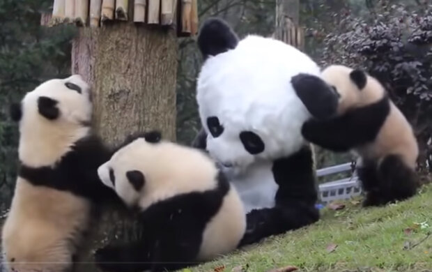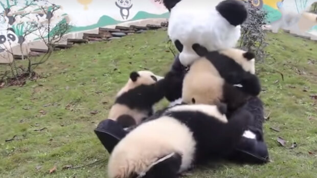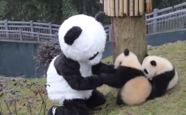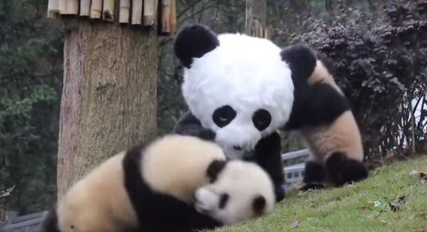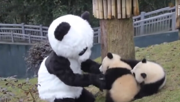 K tomu zaměstnanec nasadí speciální plyšový černobílý oblek, aby si mladé pandy myslely, že je před nimi dospělé zvíře.