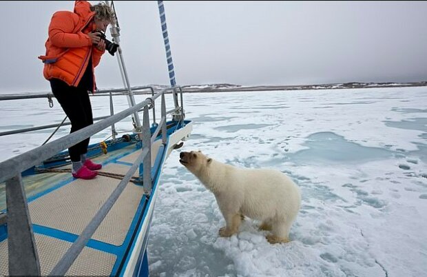 Arktická jachtařka se dostala velmi blízko ke zvědavému lednímu medvědovi, když se pokusil vyšplhat na její člun
