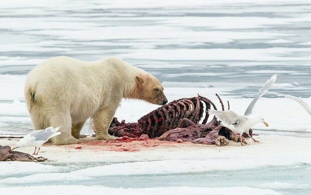 Medvěd byl tím člunem tak fascinován, že opustil jatečně upravené tělo mrože, které jedl, aby prozkoumal plavidlo.