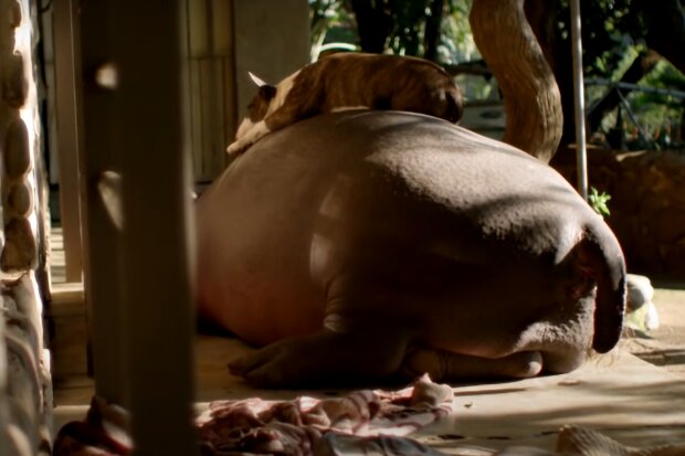 Kromě hrocha mají také další domácí mazlíčky – psy. Zvířata nikdy nejsou v rozporu, a dokonce se objímají během spánku.