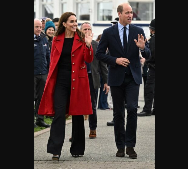 Kate Middleton navštívila Wales v červeném kabátě se zlatými knoflíky značky LK Bennet.