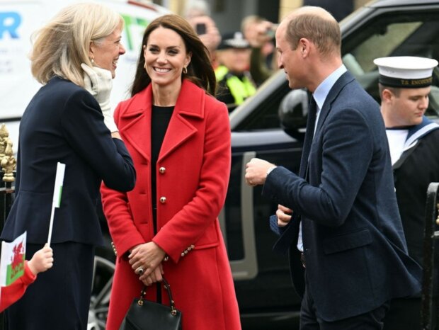 Na cestu do Walesu si Catherine vybrala dlouhý červený kabát se zlatými knoflíky a široké černé kalhoty a k obrazu přidala malou černou tašku.