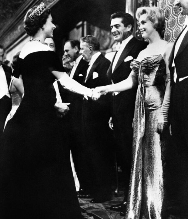 Zlaté brokátové šaty s odhalenými rameny vypadaly přinejmenším neskromně, ale Alžběta II. se tím nenechala zahanbit – přátelsky promluvila k Monroe a pozdravila její ruku.