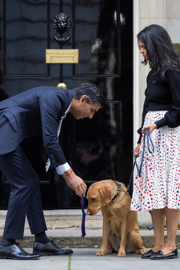 Daily Mail sdílel video Rishi Sunaka a jeho manželky Akshaty Murthy, jak jdou po chodbě Downing Street číslo 10 se svým nejnovějším členem rodiny, labradorským retrívrem jménem Nova.