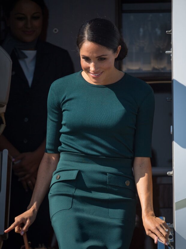 Během návštěvy Irska v roce 2018 vévodkyně ze Sussexu vystoupila z letadla v dalším zeleném oblečení: tmavě zelená tužková sukně s nášivkou Givenchy a pletený top Givenchy se zeleným kulatým výstřihem.