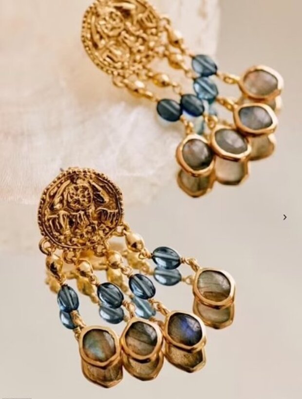 Šperk je vyroben z recyklované mosazi. Každá náušnice se skládá ze čtyř pramenů modrých drahokamů visících na jediném zlatém efektním nýtu ve stylu starověké mince.