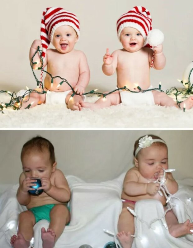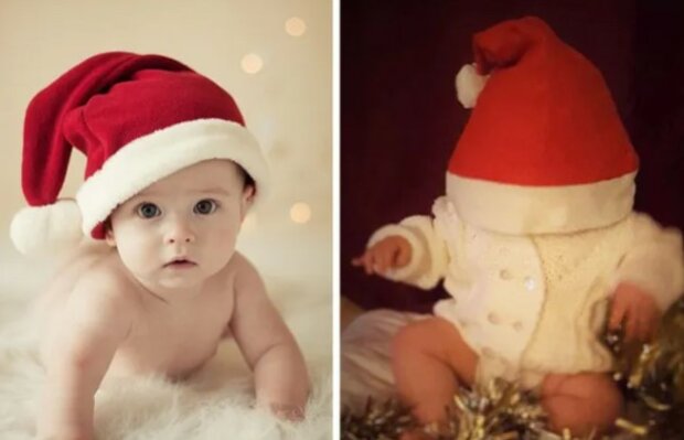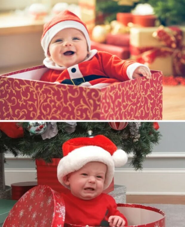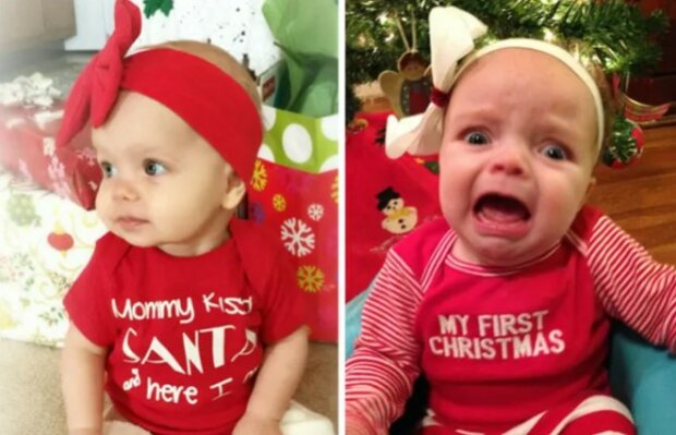 Někdy se to stane: oblek sedí, mašle se také nějak drží. A dítě je stejně nešťastné. Nápis mimochodem u dívky vpravo zní: "moje první Vánoce."