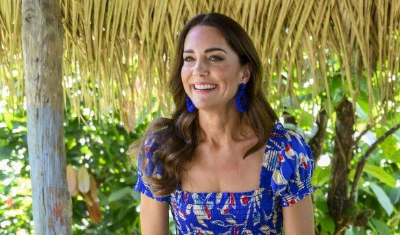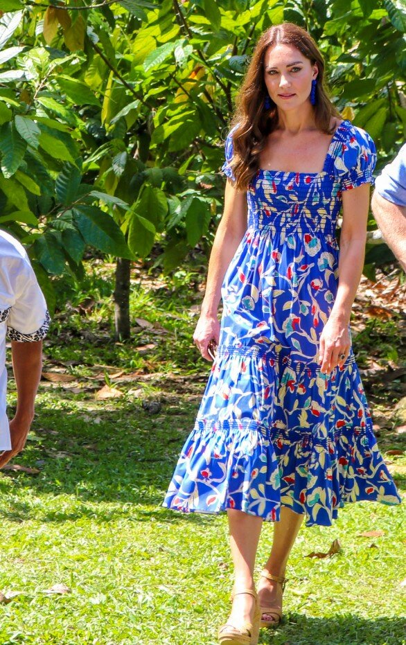 Například během cesty do Belize měla Middleton na sobě modré květinové šaty Tory Burch.