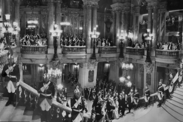 Královna Alžběta II. stoupá po schodech Opery v Paříži ve Francii.