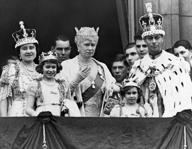 Královna Alžběta stojí za svou babičkou a královna matka je vlevo.