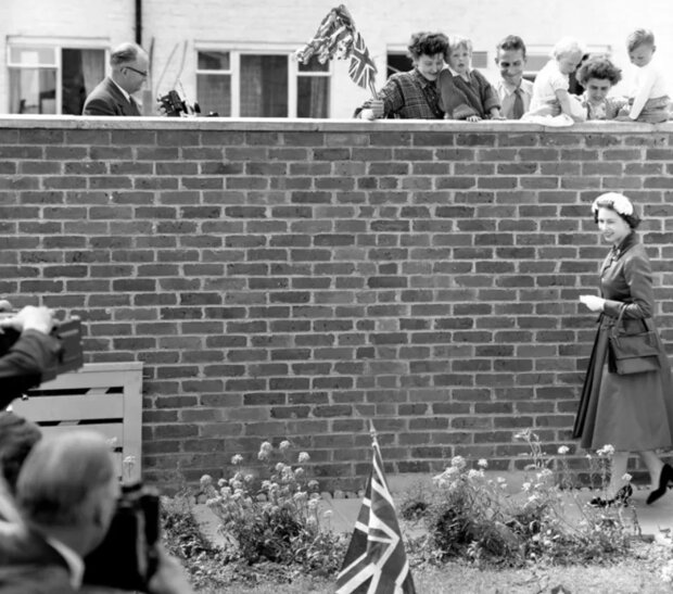 Královna je zde předmětem zkoumání sousedů při návštěvě domu manželů Eddie Hammondových v Crawley New Town v Sussexu, 1958.