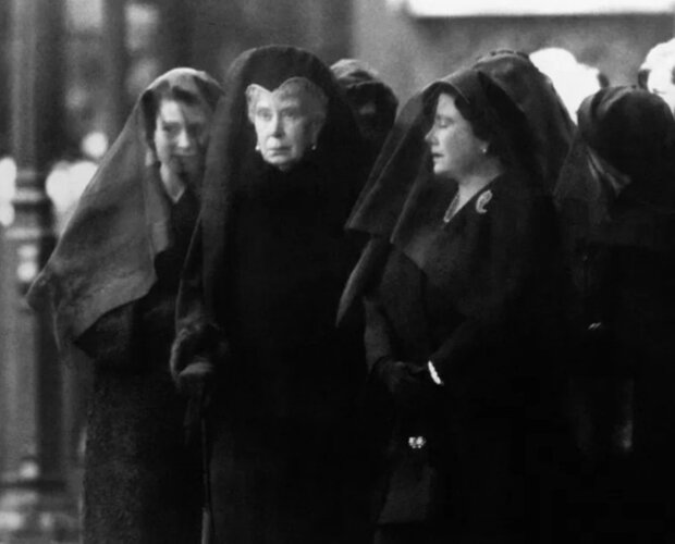 Pohřeb Alžbětina otce. Na fotografii - královna Marie, jeho matka, sleduje, jak je tělo Jiřího VI. přivezeno do Westminster Hall v Londýně na rozloučení.