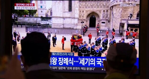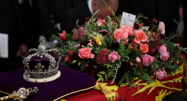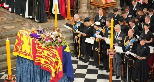 Před bohoslužbou byla královnina rakev v prvním ze tří průvodů během dne převezena z Westminster Hall, kde od středy odpočívala.