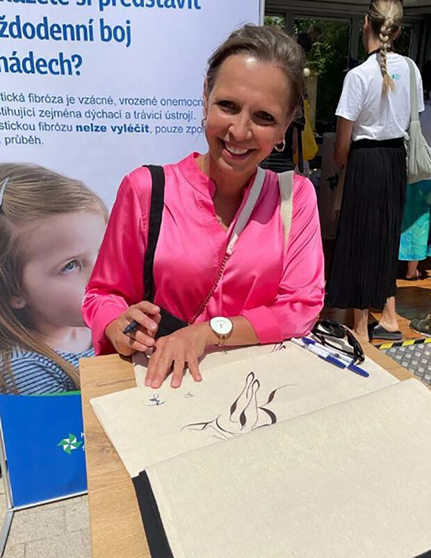 Herce doprovázela malířka Michaela Žemličková, která je autorkou kresby na taškách, které se nyní ve Varech staly hitem. Výtěžek pomáhá nemocným cystickou fibrózou.