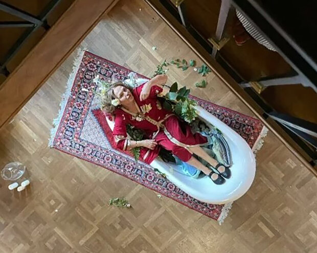 Dotyčné šaty patří Dagmar Havlové a líbí se jí natolik, že si je nyní oblékla, aby je zachytila ve vaně.