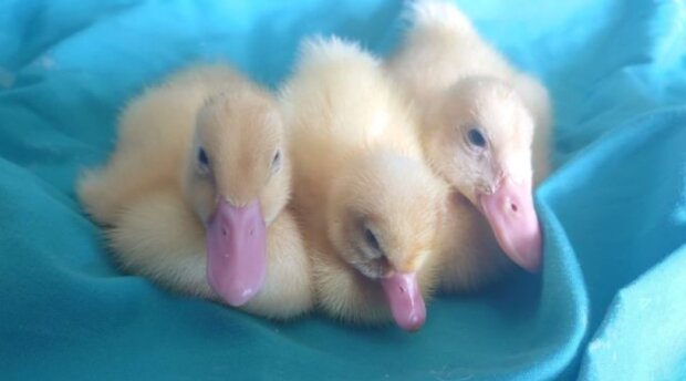 Nyní kachňata, která se jmenují Bip, Pop a Mip, žijí spolu s domácími kuřaty.