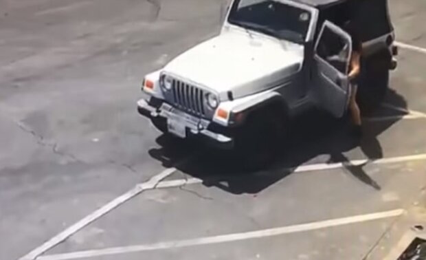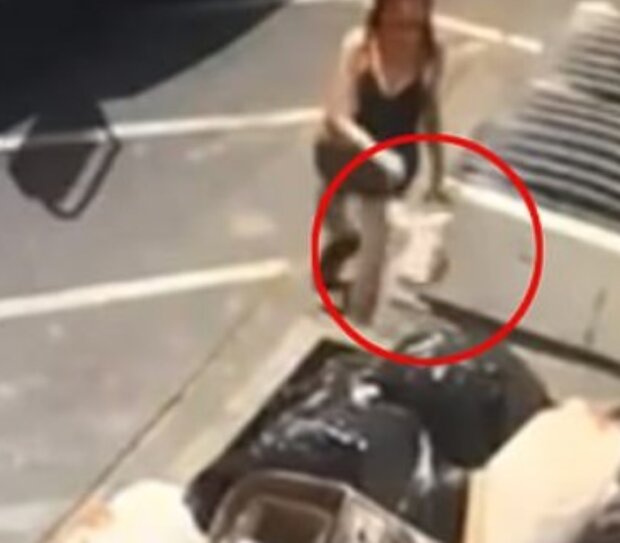 Kamery natočily ženu, která vystoupila z bílého džípu, prozkoumala popelnici a pak tam hodila pytel se štěňátky.