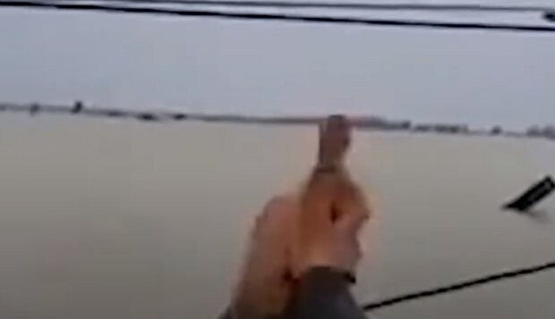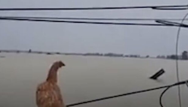 Během povodně prováděli záchranné práce podél místní přehrady, když spatřili slepici sedící na elektrickém vedení.