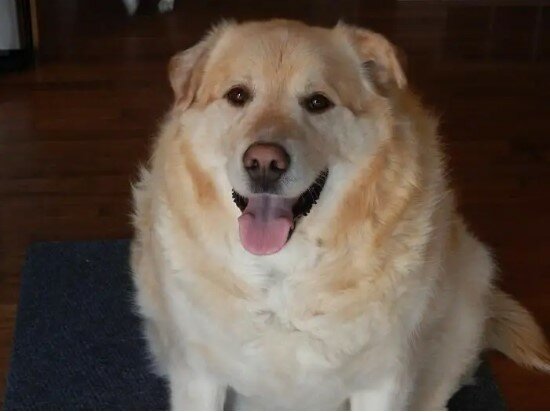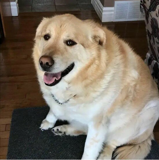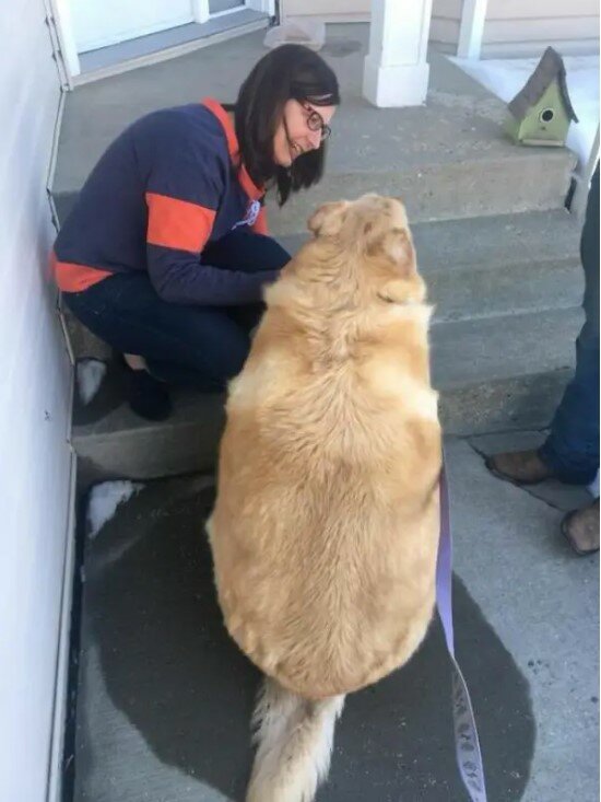 Retrívr vážil 78,5 kg, potřeboval shodit polovinu vlastní váhy. Kai strávil 20 minut lezením po malém schodišti do domu Pam.