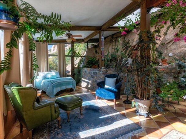 K dispozici jsou 3 ložnice, několik koupelen, velký obývací pokoj s kuchyní, knihovna, herna a velký počet vedlejších místností. Zevnitř vypadá dům jako skutečné umělecké dílo.