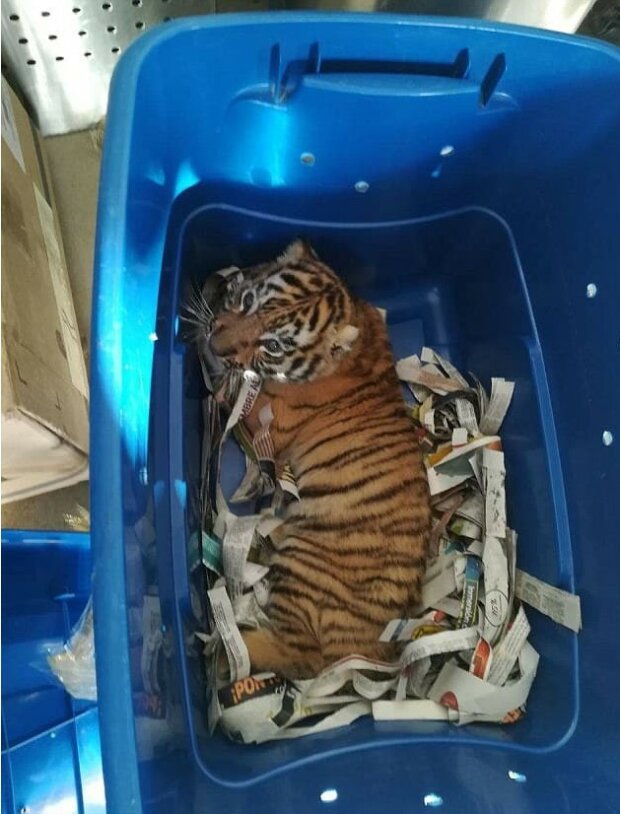 To, co viděli, je vyděsilo! Uvnitř ležel malý tygřík - byl velmi slabý po obrovské dávce sedativa, která mu byla podána před odesláním! Tygr měl dehydrataci a celou dobu trpěl nedostatkem vzduchu!
