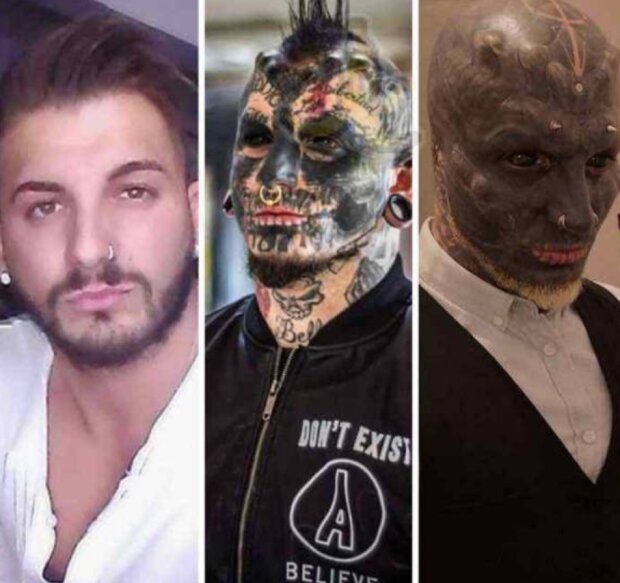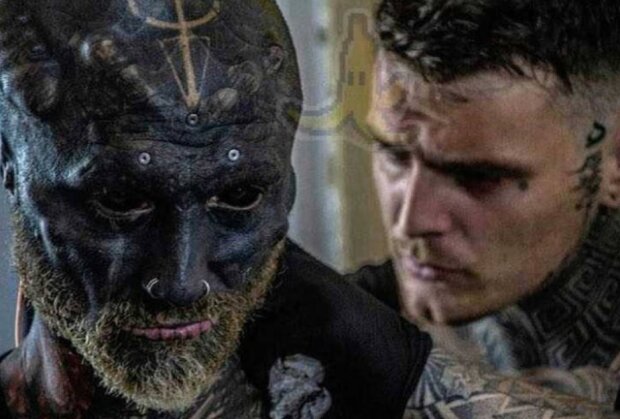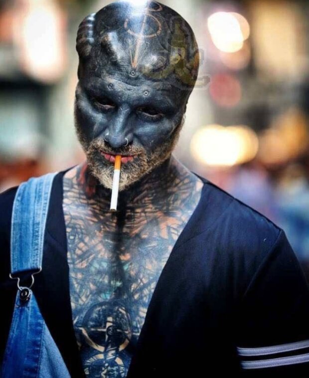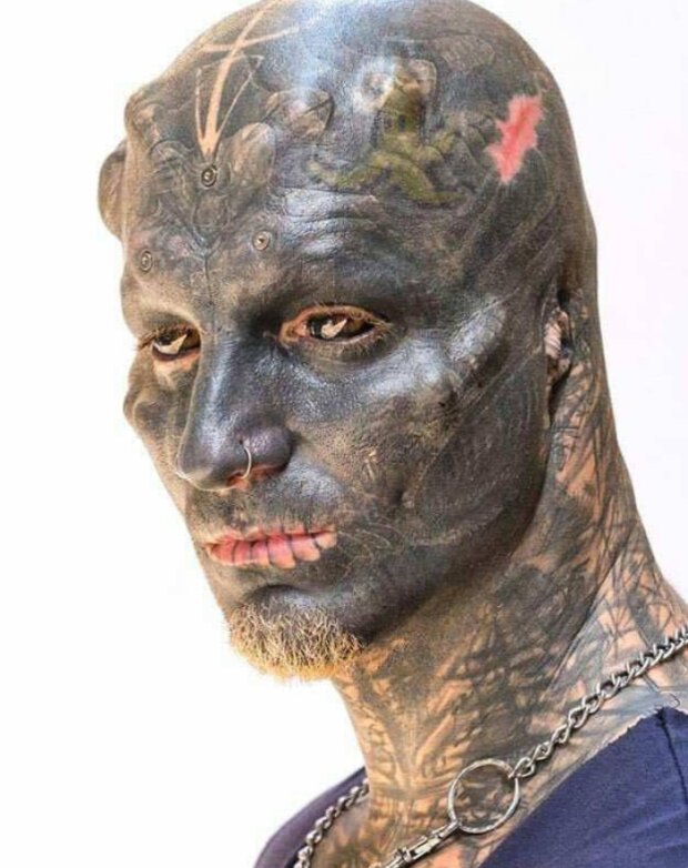 Obličej a zbytek těla jsou tetování, uši jsou uříznuté, oční bulvy jsou také tetované a na hlavě, na kůži i pod kůží jsou kilogramy piercingu.