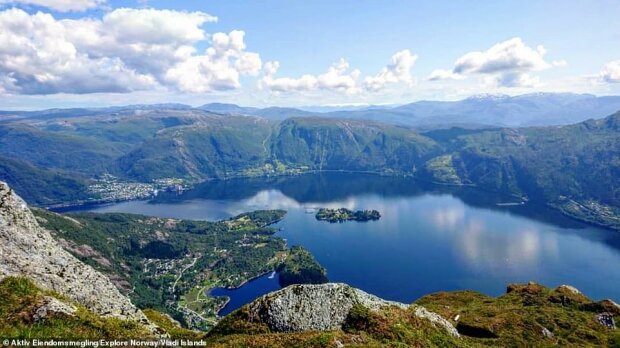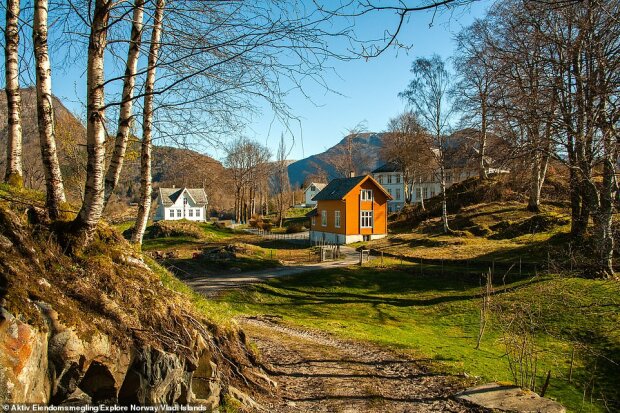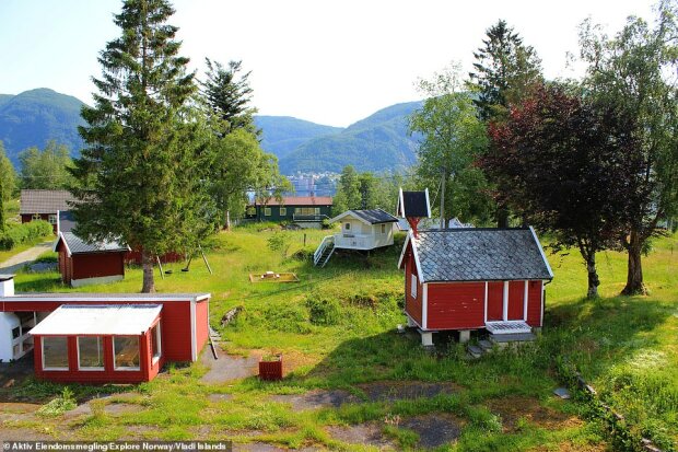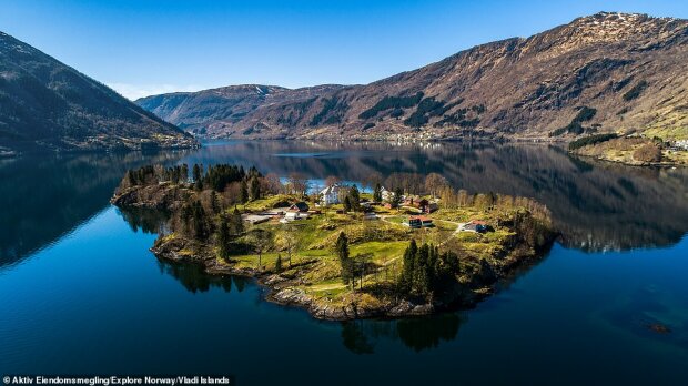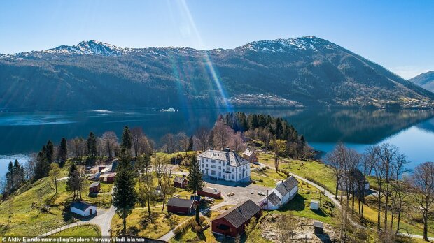 To, co za tuto velkou útratu získáte, je ostrov „dokonale umístěný“ uprostřed norského Sørfjorden (Osterøy), který má 23 akrů lesů, luk a cest a 30 budov - včetně hlavní budovy.
