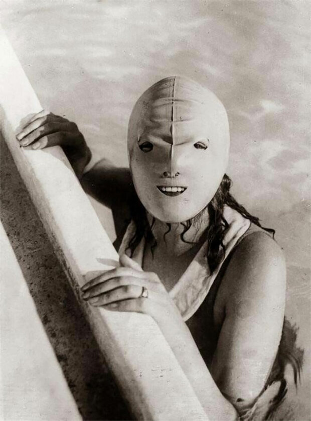 Plavecká maska na ochranu pokožky žen před sluncem, 20. léta 20. století