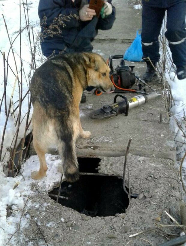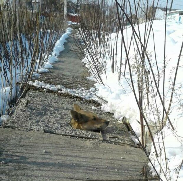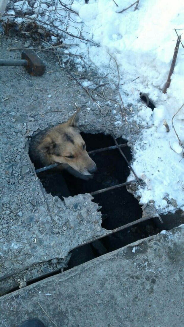 Brzy ráno se lidé vrhli do práce a všimli si, že z betonu trčí psí hlava. Chudák se snažil zahřát na topném potrubí a spadl do jedné z cel. Pes se nemohl dostat ven sám.