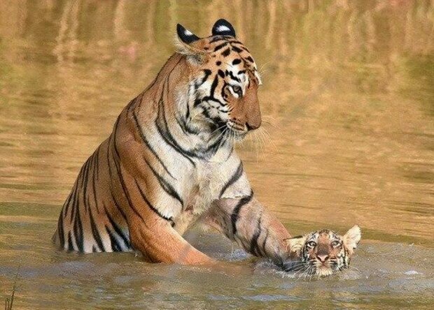 Velká a silná tygřice starostlivě přidržuje mládě ve vodě. Její chování je tak podobné lidskému, že lidé nemohli uvěřit vlastním očím, jak tato hrozba živočišné říše že být natolik něžná a starostlivá vůči svému potomkovi.