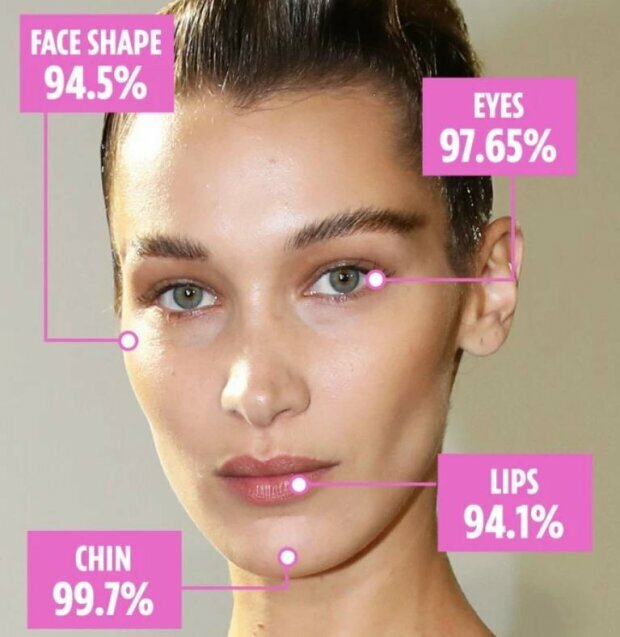 Model Bella Hadidová, její tvář na 94,35% v souladu s „ideálem“ „zlatého řezu“.