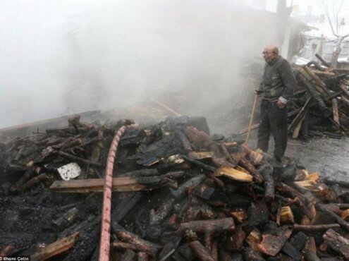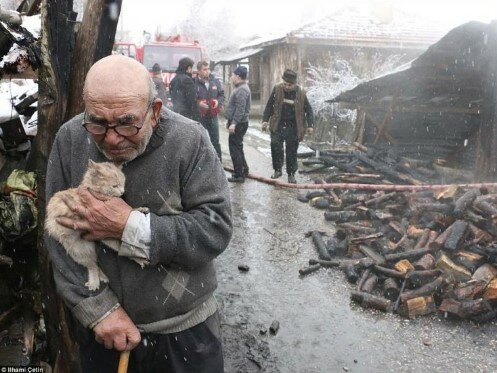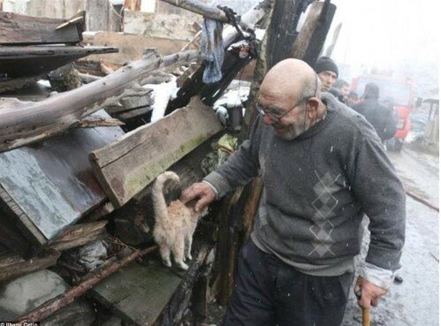 Požár zavinil sám. Pokoušel se rozpálit oheň v kamnech, ale dříví bylo vlhké, takže se mu to nedařilo. Takže tam přidal trochu benzínu... Za okamžik oheň zachvátil celý dům. Alimu, jeho rodině a tomuto koťátku se podařilo uprchnout... Všechny věci, kočky, slepice a dům shořely.