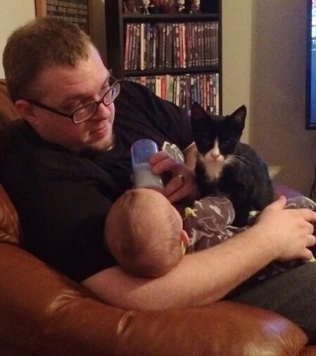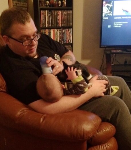 Když Matt krmí svého syna, Dough pomáhá.