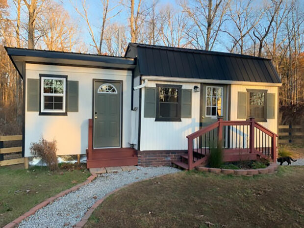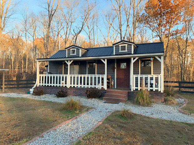 Před pěti lety získala rodina Brinks 8,5 hektaru půdy v Kentucky za 57 000 USD a přeměnila ji na vlastní farmu (vlevo, domov děti a vpravo, dům rodičů).