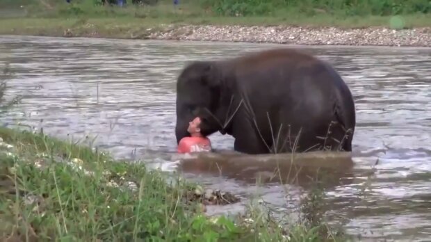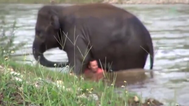 Slůně se rychle přiblížilo k "tonoucímu" a natáhlo k němu svůj chobot. Pak muži pomohlo dostat se z vody.