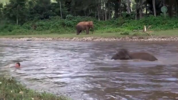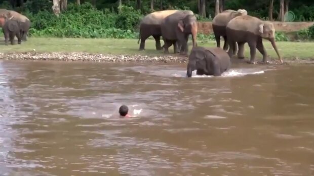 Jeden muž si chtěl zaplavat v řece se silným proudem. Podél řeky se procházelo stádo slonů. Nejmenší z nich si všiml plavce a vrhl se k němu. Zjevně si myslel, že se topí.