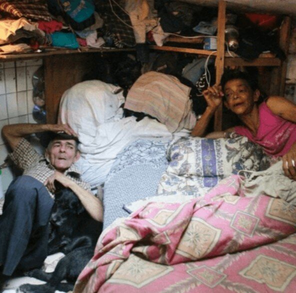 Nehledě na nelidské podmínky si nestěžují. Naopak jsou šťastní, že se našli. Žije s nimi také venkovní pejsek.