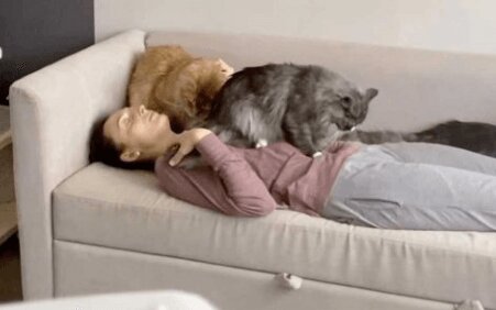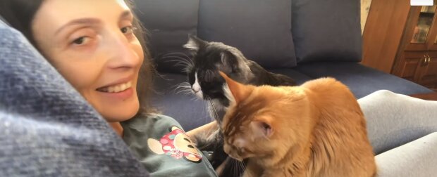 Společně s masáží si také užívá vrnění koček, což je jisté znamení, že se jim tento proces líbí. Maine Coons, svými rozměry, jako by byly stvořeny pro takovou činnost, a proto Ekaterina si každý den užívá masáž.