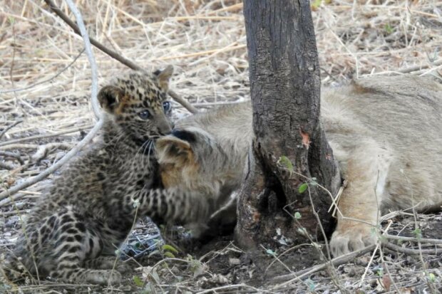Lvíčata leoparda přijala jako domorodce, pravděpodobně proto, že o světě kolem nich moc nevědí. Stává se to v Asii a tam mají lvice zvyk odcházet a vychovávat děti samy před porodem, aby jim dospělí lvi nic nedělali.