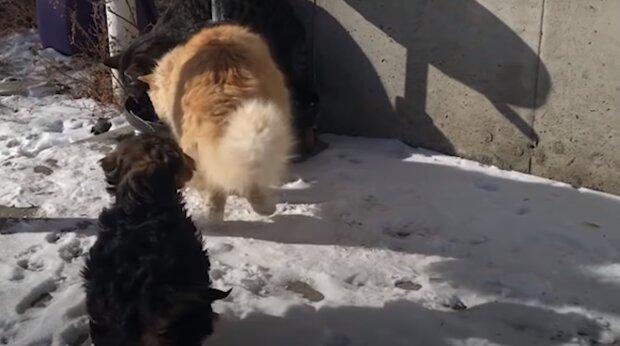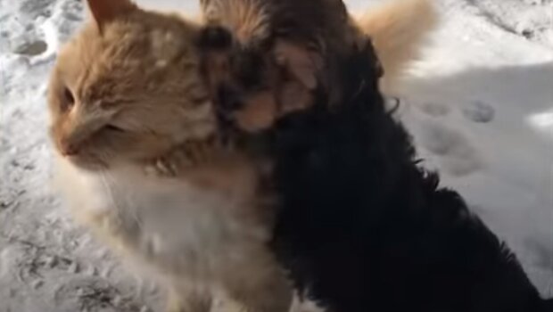 Štěně stojící na dvou tlapkách obejmulo zrzavou kočku. Ta trpělivě snášela všechny něžnosti štěněte a dokonce mu dovolila kousnout se za ucho. Nakonec to však nevydržela a odešla pryč od nepříjemného „fanouška“.