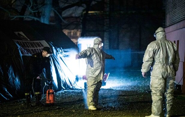 Pracovníci na německo-polské hranici podstupují dezinfekci poté, co testovali projíždějící na koronavirus. Jako prevenci proti šíření nemoci Covid-19 Polsko i Česká republika zcela uzavřely hranice.
